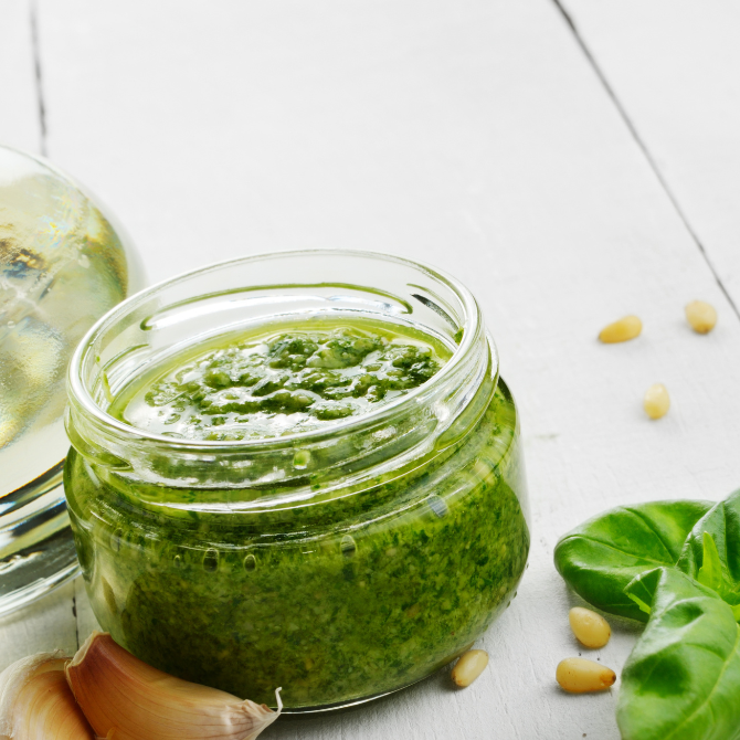 Albahaca orgánica, aceite de oliva de primera prensada, ajo criollo y un toque de nuez moscada